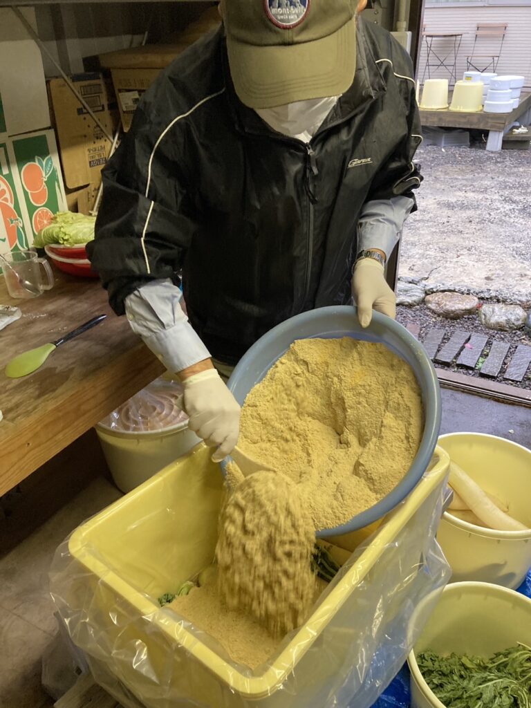 並べた大根に満遍なく糠を入れ、押し蓋を敷いて