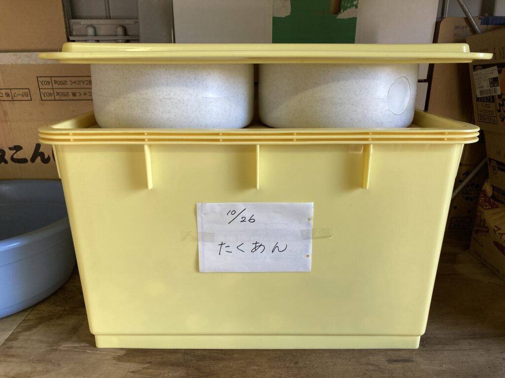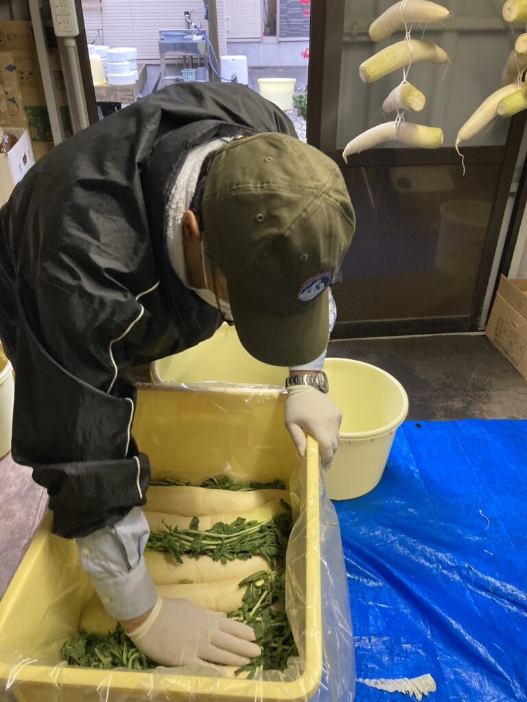 漬物の容器も大根を並べやすい四角い形に替えたので作業が楽でした。隙間には大根菜っ葉をびっしり敷いて