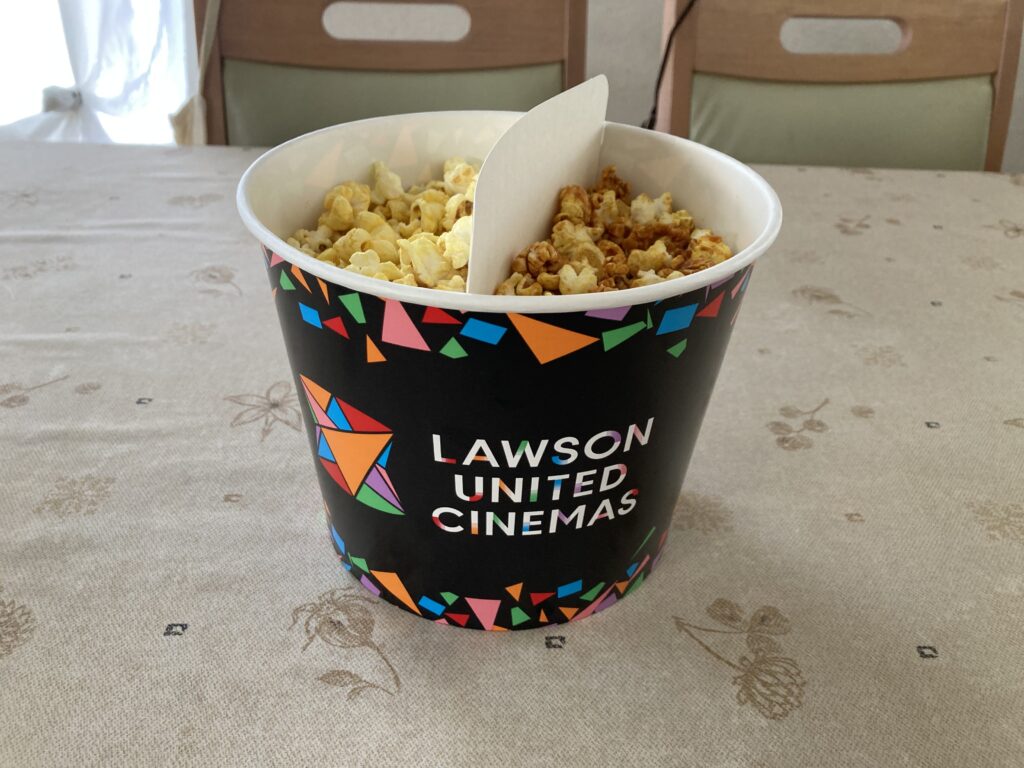 飲み物と一緒にポップコーンを買ったのですが、上映中は食べる雰囲気ではなく持ち帰ったのですが、バケツみたいなサイズで妻と二人で一日かけても食べきれないサイズで、ちょっと懲りたかなという感じです。