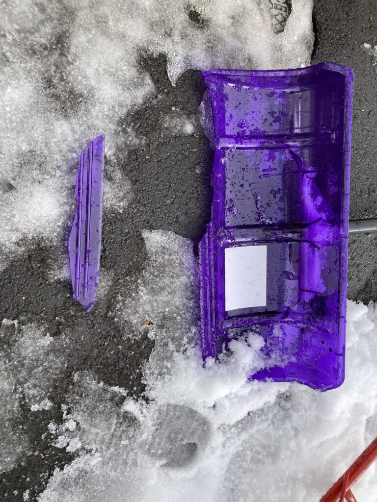突然の風に飛ばされ、一部を損傷してしまった。長い間私と共に戦ってくれた有り難い友のような関係の「紫ジョンバ」。これで雪を押すと雪の表面が掃いたような仕上がりになるのでとても好きだった。道路脇に刺さっていたものを連れて帰って見たらこの損傷。復帰は叶うまい。