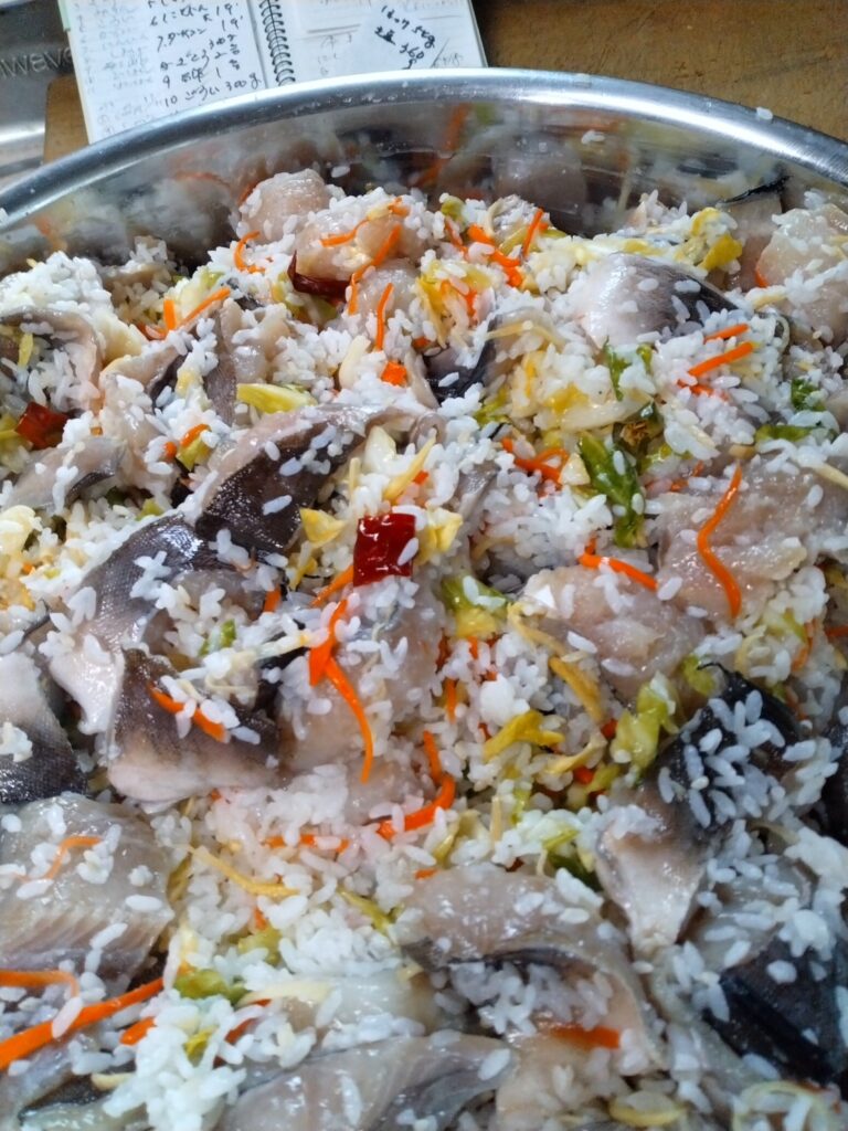 ホッケの飯寿司。生から作るこれの方がずっと難しいのですが。あとは鰊付け、沢庵等。